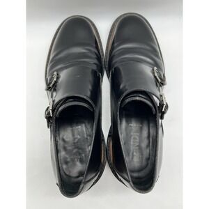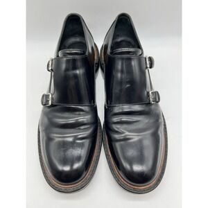 This product is a pre-owned vintage Fendi dress shoe in black, designed in a monk strap style specifically for men. The size of the shoe is 9, making it a comfortable fit for a variety of dressy occasions. With the renowned Fendi brand and classic black color, these loafers offer a sophisticated and stylish touch to any outfit. Perfect for adding a touch of luxury to a formal ensemble, these dress shoes are a timeless addition to any man's wardrobe.