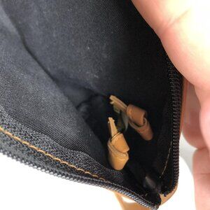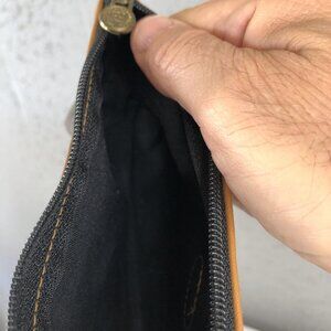 Condition: Fair to Good - moderate overall wear with visible flaws. There is a dark mark/stain inside the bag (see photo), scuffs and minor chipping to tan leather trim, and a small worn spot at edge. The zipper and pull function well. Please review all photos for details on wear and condition.