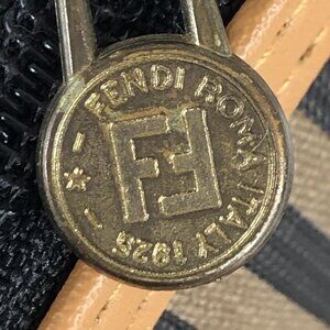 Features gold tone zipper pull embossed with "FENDI ROMA ITALY 1925" and FF logo