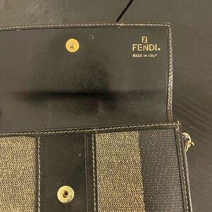 Stylish wallet featuring black and brown stripes. Includes a gold chain for easy carrying.