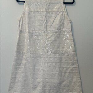 This Fendi dress showcases a sophisticated sheath silhouette in a pristine white shade, ideal for both casual and work occasions. The sleeveless design is complemented by a halter neckline, offering a refined and contemporary appeal. Its mini length adds a playful touch to the overall elegant look.