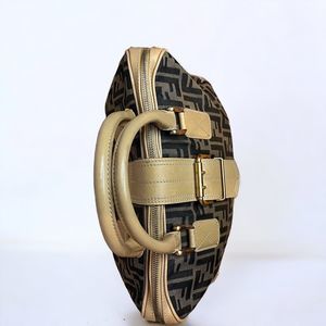 This vintage Fendi Zucca doctor bag is a must-have for any fashion-forward woman. Made in Italy, this large bag features a trapezoid shape and a brown exterior color with Fendi's iconic Zucca pattern. The bag is made of leather and canvas fabric, with gold-plated hardware accents including a lock and buckles on the handles.