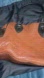 Elegant brown leather duffel with black handles. Ideal for travel.