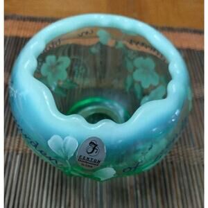 This vintage Fenton Art Glass Floral Rose Bud Vase is a beautiful hand-painted piece in a light green color. Featuring a floral pattern with flower petals as the subject, this vase is a unique and charming addition to any home decor. Signed by the artist and made in the United States with a glossy finish, this original piece of art glass is a true collectible for those who appreciate handmade craftsmanship and antique aesthetics.