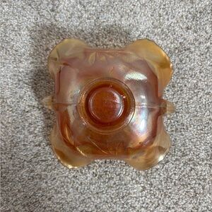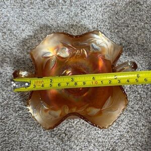 Vintage Fenton Carnival Glass Handled Candy Dish Strawberry Sprigs Marigold. Good preowned condition. Measurements in photos.