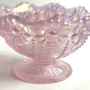 Such a gorgeous Fenton pink iridescent fairy lamp! Has original stickers, mark on bottom, and etched George Fenton signature inside of the top half. Handpainted and signed by the artist. See photos - one minor flea bite on rim of top half, otherwise in great condition. Measures 6โ tall x 4 1/2โ wide.