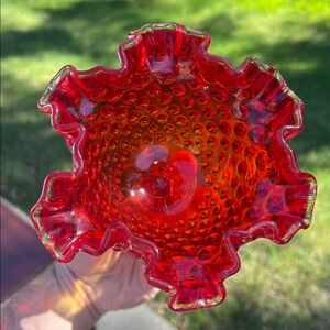 Vintage Fenton Hobnail Amberina Glass Ruffled Edge Compote Candy Dish