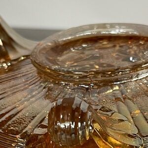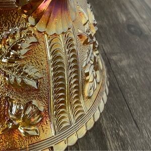Measuring 5 inches in height and 10 inches in diameter, this large footed fruit bowl is perfect for serving or showcasing. The production style of Carnival Glass and the item's origin in the United States make it a must-have for collectors. This beautiful bowl is a great way to add a touch of sophistication to your dining experience.