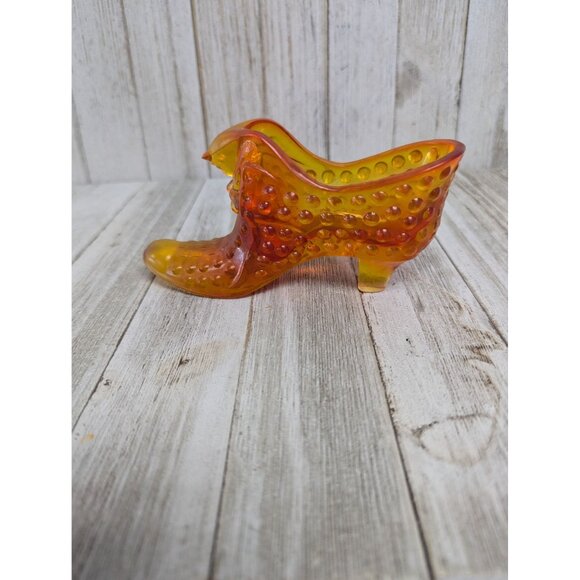 This exquisite vintage Fenton glass shoe in marigold showcases the intricate Daisy and Button design, perfect for collectors or as a charming decorative piece. Its unique color and craftsmanship make it a standout addition to any vintage glass collection or home décor.
