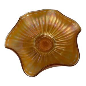 This beautiful Fenton Carnival Glass “Stippled Rays” ruffled bowl features a striking radiating starburst pattern on the base and a brilliant marigold iridescence with hues of gold, amber, and pink. The stippled texture enhances the light reflection, making it a stunning display piece for collectors or vintage glass enthusiasts.