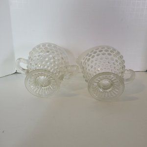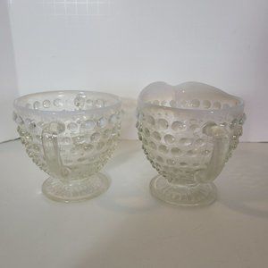 Vintage Fenton Opalescent Footed Glass French Cream & Sugar Set. There is no manufacturing information on them. There is a rough spot in the bottom of the cream pitcher that occurred during manufacturing. Photos are an important part of the description.