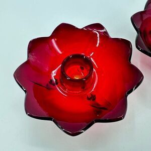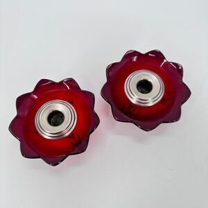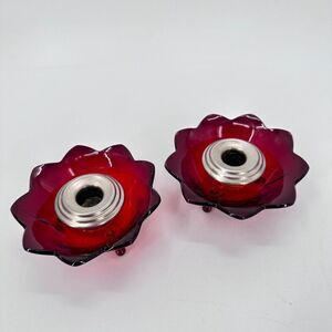 Vintage Fenton Ruby Red Amberina Glass Footed Lotus Candle Holders & Inserts HTF