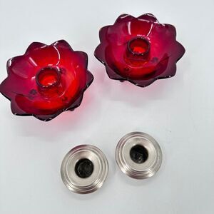 Vintage Fenton Ruby Red Amberina Glass Footed Lotus Candle Holders & the Hard to Find Metal Inserts