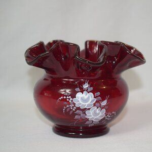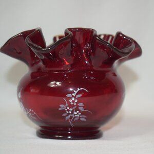Vintage Fenton Ruby Red Hand Painted 3 inch Ruffle Vase Signed Marilyn