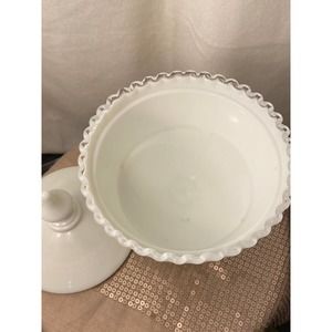 Vintage Fenton Silvercrest Ruffled Edge Milk Glass Footed Pedestal Candy Dish with Lid. Beautiful mid-century design, this iconic candy dish could be found in many a Grandmother’s house filled with mints or butterscotch candies! So many possible uses!