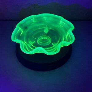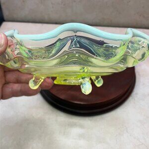 Vintage Fenton Vaseline Glass Green Wave Bowl 3 Toed Pedestal Amazing Glow 1930s