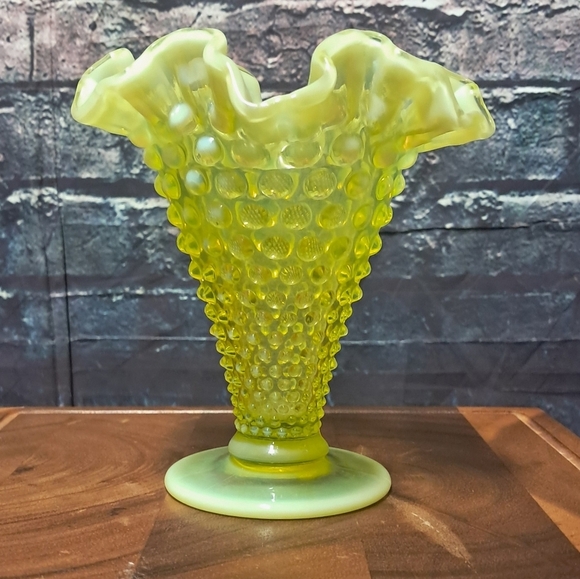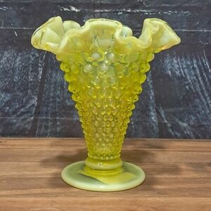 Vintage 8" Fenton Vaseline Topaz Opalescent Hobnail Ruffle Vase in excellent condition. 🌎