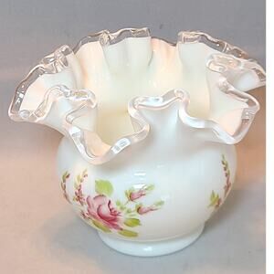 Vintage Fenton White Floral Milk Glass Vase, Artist Signed Hand Painted Art Glass 4H x 5W. Signed by Freda H. No chips or cracks. Stunning beauty for any Fenton collector. Floral is not included. This vintage Fenton milk glass vase features a delicate ruffled edge and hand-painted floral design, signed by the artist. The smooth white milk glass enhances the intricate brushwork, making it a standout collectible. Whether displayed as a centerpiece or used for fresh flowers, its classic charm and artistic craftsmanship make it a must-have for collectors and vintage enthusiasts. A timeless addition to any home decor.