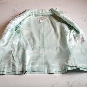 Fully-lined soft mint green button-down jacket from Feraud with back waist detail, padded shoulders, hidden button placket and two slash pockets.