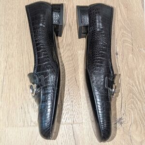 Salvatore Ferragamo's loafers shine with understated luxury in a crocodile brown leather, accented by the brand's iconic gunmetal Gancini hardware. The squared apron toe and wrapped block heel offer contemporary polish to this Italian classic.