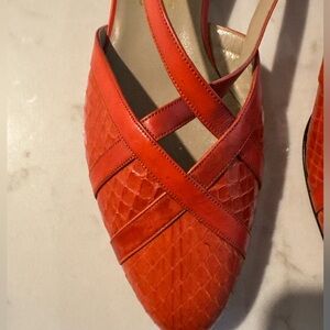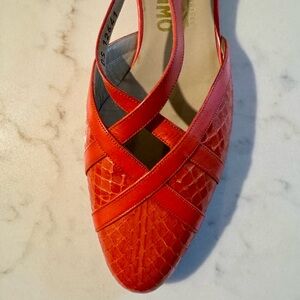 Adjustable slingback sandals in an orange/red color. Color changes a bit in the light. They are very vibrant!