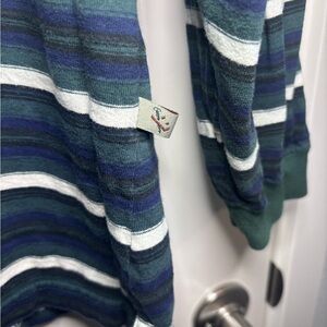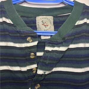 Stylish long sleeve Henley shirt with blue, green, and white stripes. Features a button-up neckline.