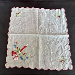 Vintage 50s Festive Red and Green Embroidered white handkerchief with Holly, bells and candle motif. Scalloped edges finished with red.
