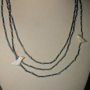This vintage necklace exudes a timeless charm with its delicate turquoise and silver bead combination. The mother of pearl bird charms add a whimsical touch, making it a unique piece. Its multi-strand design offers a layered look that complements any attire, evoking a sense of nostalgia.