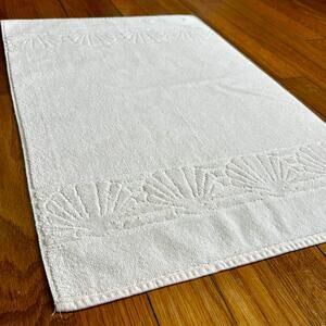 Vintage Fieldcrest hand towel in a soft peach-pink hue, featuring a raised shell motif along both ends. Made in the USA from 100% cotton and measuring approximately 16” x 25.5”, this towel adds a subtle coastal or vintage charm to any bathroom or guest space. High-quality, absorbent, and well-crafted by a trusted American brand.