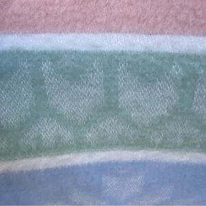 Vintage Fieldcrest Reversible Woven Lap Couch Blanket. Winter themed, with polar bears and snowflakes. Pastel Pink, Blue and Green. Twisted fringe on the two ends. Very cuddly and soft! It has the texture of soft flannel, but the actual material content is unknown.