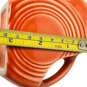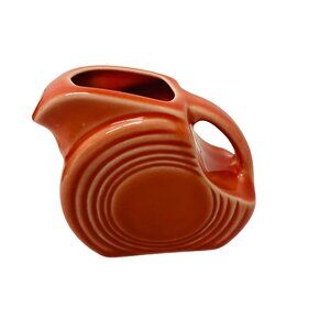 Charming vintage Fiesta Ware small disk pitcher in a vibrant tangerine hue. Ideal for collectors or adding a retro touch to your kitchen decor.