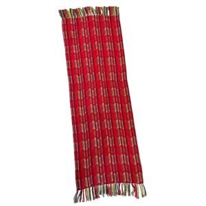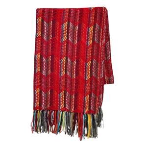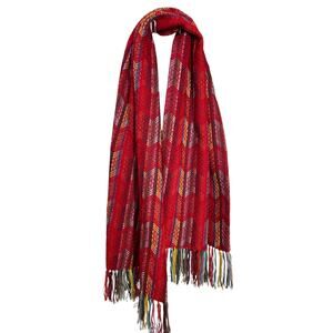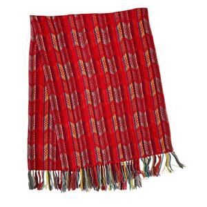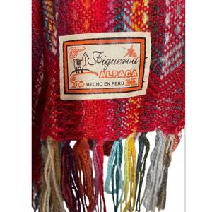 Genuine handwoven alpaca wool scarf made in Peru. Features a bold red chevron pattern with multicolor accents and fringe tassels. Super soft, lightweight yet warm, and perfect for fall/winter layering or gifting.