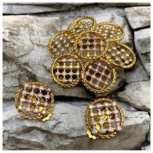 Adorable vintage dimensional dome aurora borealis art glass prong set chaton rhinestones gold plated brooch & clip earrings. Very lightweight set. Unsigned beauty. Minor wear. Brooch measures 2” in diameter & earrings are 1” diameter. This is a VINTAGE item so please expect wear as shown. What you see is what you will receive. 100% authentic.