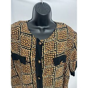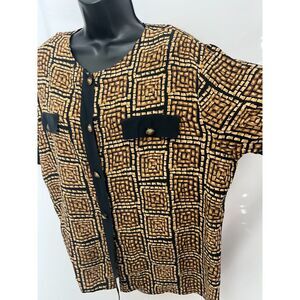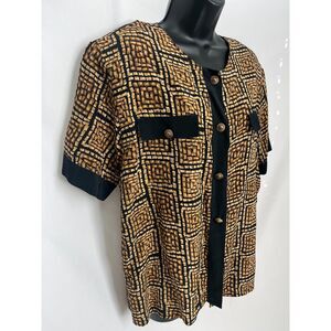 Vintage Fiji Sport 100% Silk Blouse Gold Black Geometric Print Size L Retro Cute