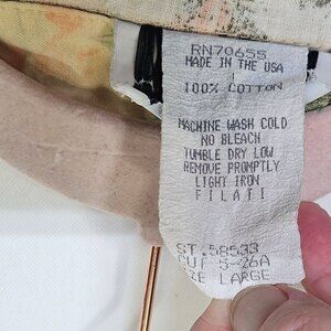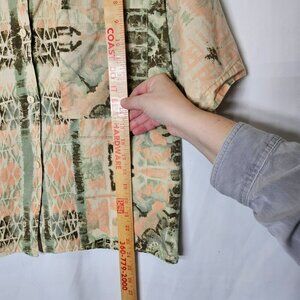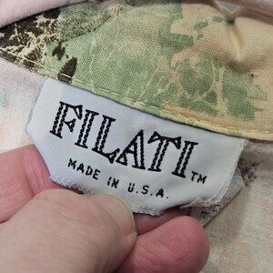 This vintage Filati shirt embodies an abstract aesthetic with green and peach hues. Made in the USA from 100% cotton, it offers a comfortable fit suitable for various casual settings.