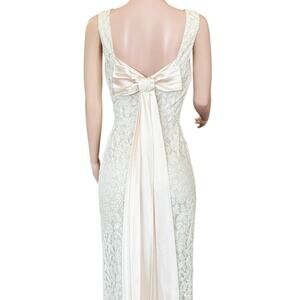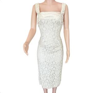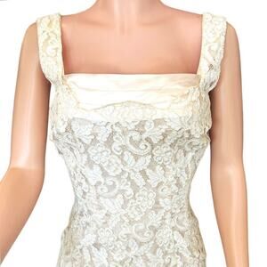 This vintage Filcol New York lace wiggle pencil sheath dress in size small is a stunning piece for any formal occasion. The dress features a sleeveless design with a zip closure and a long bow accent. The ivory color and lace fabric type give it a 50s pinup vibe, while the shift, pencil dress, and sheath style make it a versatile piece for any wardrobe.