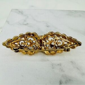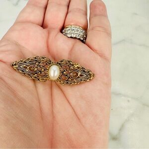 Vintage Filigree Bar Brooch Pin Faux Pearl Gold Tone Romantic Dainty Coquette