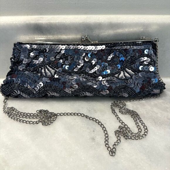 This bag combines elegance with intricate detailing. Its exterior is adorned in a delicate filigree pattern of sequins and beads, shimmering under light. The bag features a kisslock clasp closure for security and a satin-lined interior with a convenient slip pocket. Its detachable chain strap offers versatility, while silver-tone hardware complements the sophisticated design. With dimensions ranging from 9 inches wide at the top to 10 inches at the bottom and a height of 4 inches, this bag exudes timeless charm perfect for evening occasions.