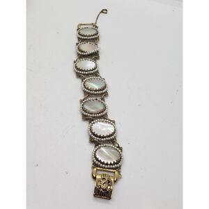Features beautiful oval panels of lustrous iridescent mother-of-pearl surrounded by faux seed pearl beading and intricate gold tone filigree metalwork. Bar link construction with ornate floral details on reverse side. Foldover clasp with built-in safety catch and chain.