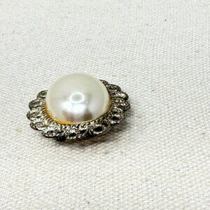 This vintage filigree brooch features a classic style with an imitation pearl center set in a gold tone. Add a touch of retro elegance to any ensemble with this timeless accessory.