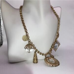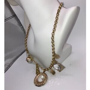 Vintage Unique Filigree Charms Lightweight Plastic Clear Crystals Gold-Tone 18 1/8" Necklace!