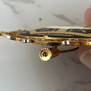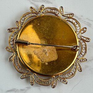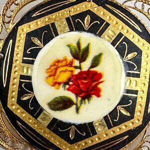 Vintage Filigree Damascene Guilloche Rose Brooch With Yellow & Red Floral Design
