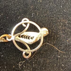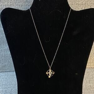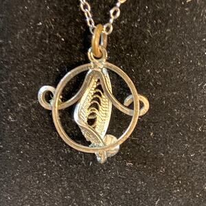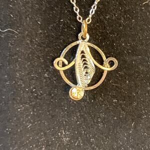 This lovely vintage necklace features a delicate 16-inch gold tone chain with a circular filigree pendant. The pendant showcases intricate scrollwork and textured detail, accented with a small clear rhinestone at the base for just the right touch of sparkle.