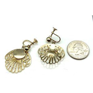 Vintage Filigree Plume Earrings, Lacy Gold Tone Art Deco Clip Ons
