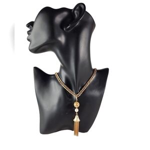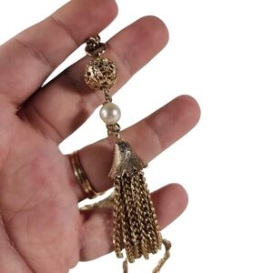 This is a lovely vintage necklace in gold tone with delicate filigree details and a gilded theme. No tarnish, it measures about 18" in length.