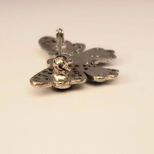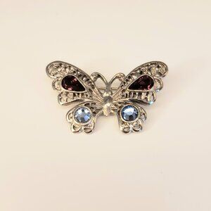Hello, you're looking at a beautiful vintage silvertone faux gemstone brooch/pin. The butterfly design has intricate filigree-like wings along with the blue and purple faceted gems. It measures about 1.5 inches across.