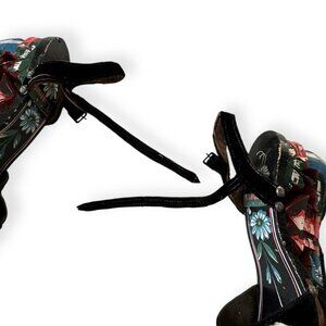 Each pair features a curved hand-carved wooden wedge sole, richly hand-painted with colorful folk floral motifs. The black velvet uppers are embroidered with red and cream flowers, and ankle ties secure the foot in a classic mid-century silhouette.