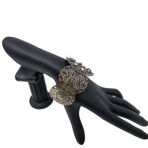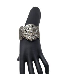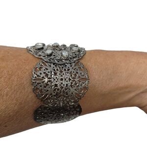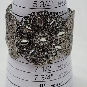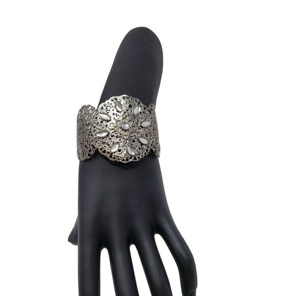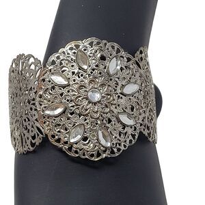 Vintage Fillagree Metal Wide Cuff Bracelet Silver Rhinestone Perforated Scroll