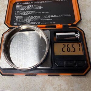 970 bracelet has width of 11 MM with inside diameter of 2.5 inches. Bracelet weighs 26.57 grams. Has normal vintage wear