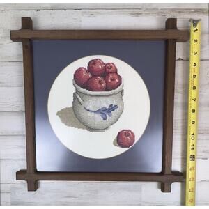Vintage Finished Cross Stitch Bowl Of Apples Picture Framed Primitive. This completed cross stitch was purchased at an estate sale. It has been custom framed in a unique wooden frame. Perfect for your country, farmhouse, primitive or cottage decor. See photos for details. Measures 15"x15".